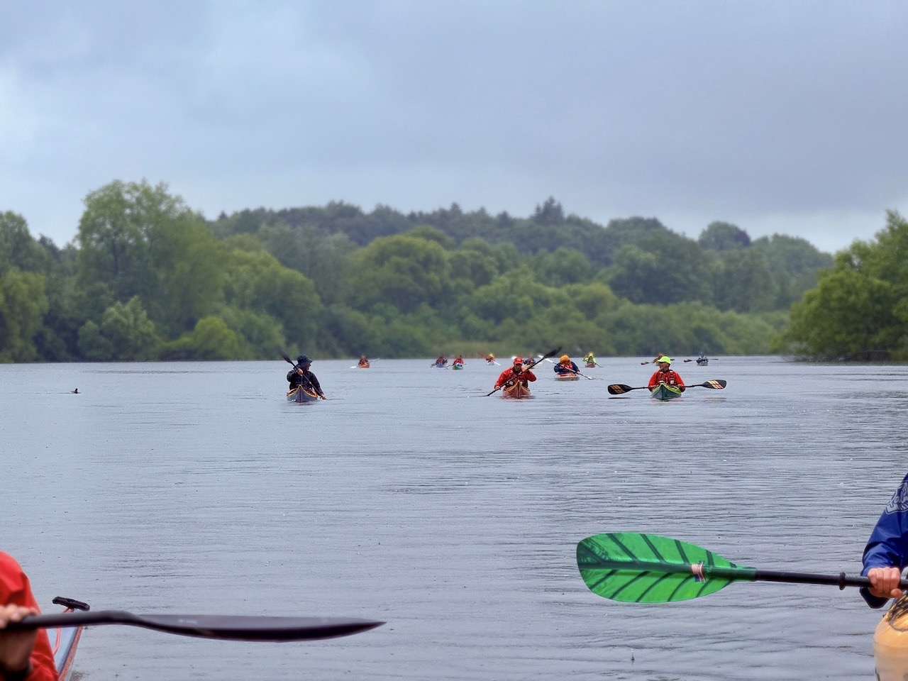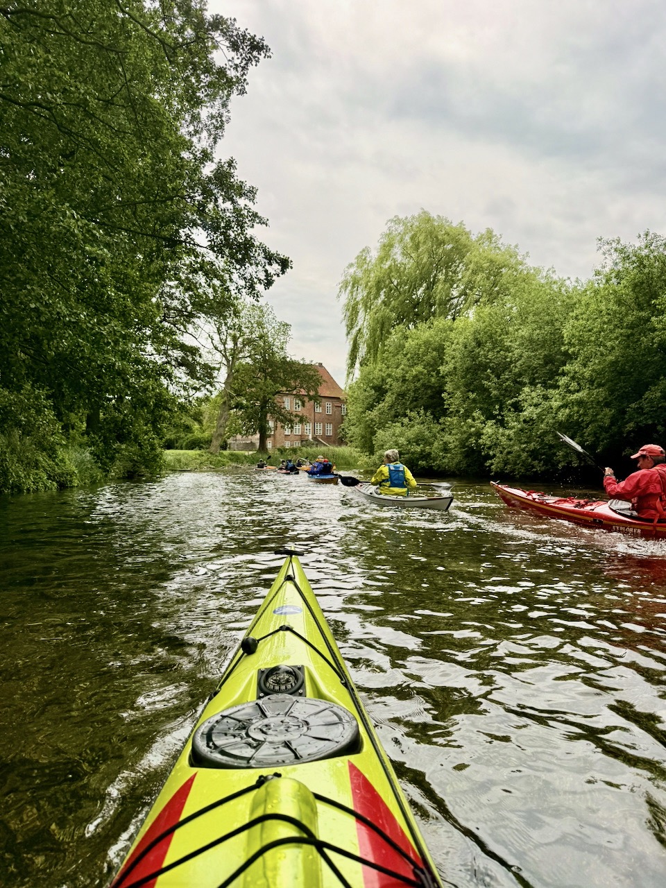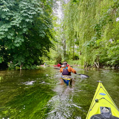 Der windigste Tag führte uns auf geschützte Abschnitte der Schwentine. Zwischen Erlenwurzeln und umgestürzten Stämmen kam echtes „Mangroven-Gefühl“ auf. In Preetz erlebten wir eine charmante Stadtdurchfahrt, unter einem Steg wurde ein Schauer kurz abgewettert. Auf dem See sorgten Wind und kurze Welle für Spaß. Tierisch war es auch: viel Wasser- und Uferwild entlang der Schilfkanten sowie einige Enten, die hofften, unser Pausenbrot zu ergattern.