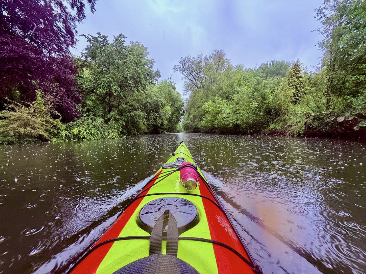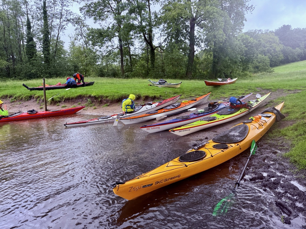Das Wochenende hatte es in sich: Laut Messstation Kiel-Holtenau fielen am Samstag, 07.06., 13,4 mm und am Pfingstsonntag 25,8 mm Regen. Dazu meldete der DWD am Sonntag kräftigen bis stürmischen Wind mit Böen bis etwa Bft 6 bis 7. Dank unserer geschützten Binnenlage blieben wir vom Gröbsten verschont und auch die Gewitter zogen knapp an uns vorbei. Trotz kräftiger Schauer gab es immer wieder sonnige Fenster, die wir konsequent nutzten. Sicherheit ging wie immer vor. Die Touren wurden täglich an Wetter, Gruppe und das Gewässer angepasst.