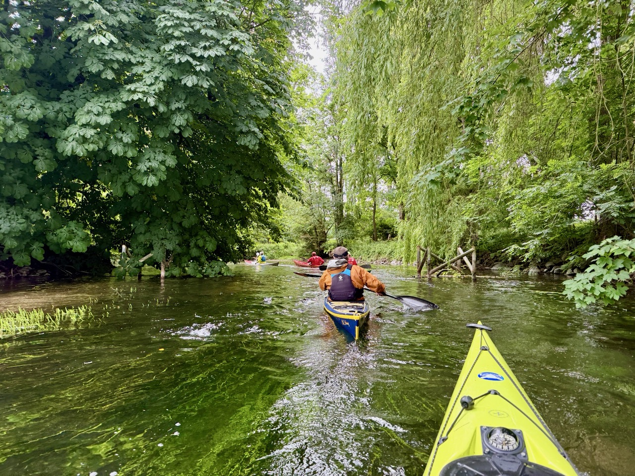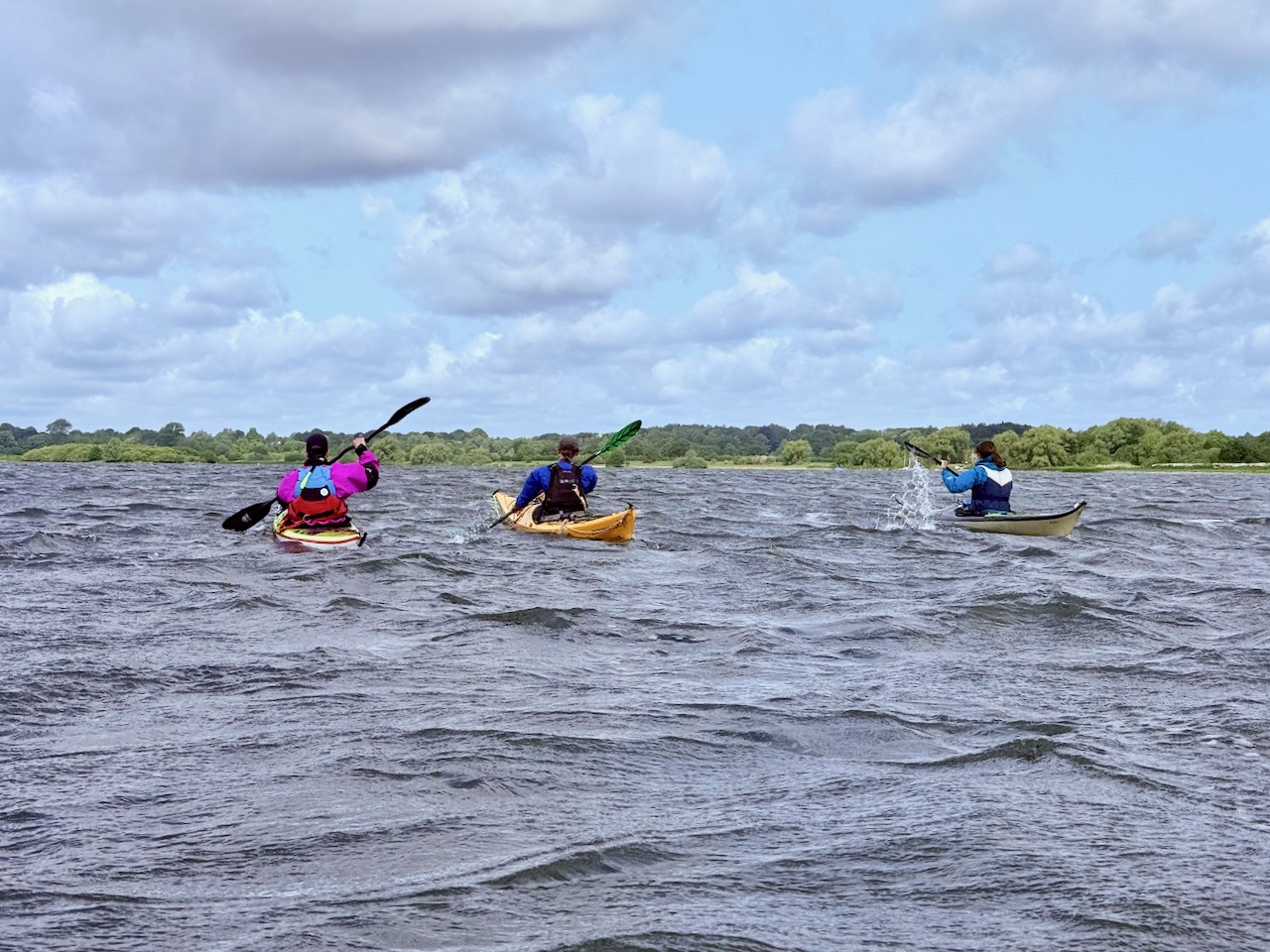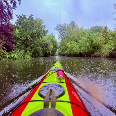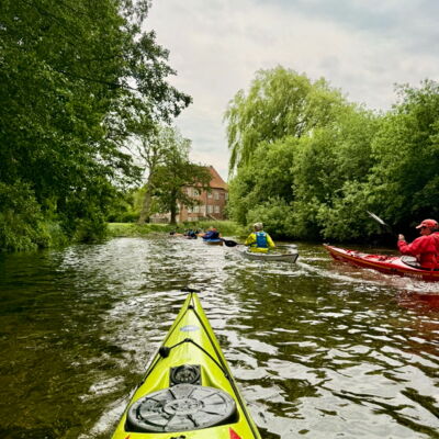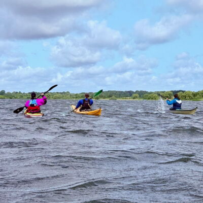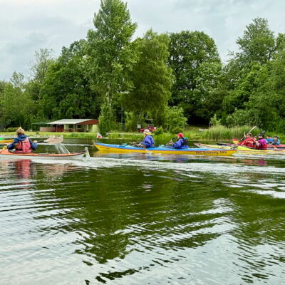 Der windigste Tag führte uns auf geschützte Abschnitte der Schwentine. Zwischen Erlenwurzeln und umgestürzten Stämmen kam echtes „Mangroven-Gefühl“ auf. In Preetz erlebten wir eine charmante Stadtdurchfahrt, unter einem Steg wurde ein Schauer kurz abgewettert. Auf dem See sorgten Wind und kurze Welle für Spaß. Tierisch war es auch: viel Wasser- und Uferwild entlang der Schilfkanten sowie einige Enten, die hofften, unser Pausenbrot zu ergattern.