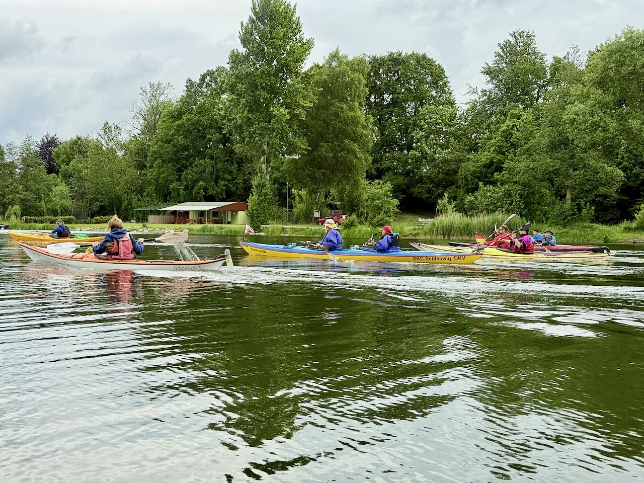 Das Wochenende hatte es in sich: Laut Messstation Kiel-Holtenau fielen am Samstag, 07.06., 13,4 mm und am Pfingstsonntag 25,8 mm Regen. Dazu meldete der DWD am Sonntag kräftigen bis stürmischen Wind mit Böen bis etwa Bft 6 bis 7. Dank unserer geschützten Binnenlage blieben wir vom Gröbsten verschont und auch die Gewitter zogen knapp an uns vorbei. Trotz kräftiger Schauer gab es immer wieder sonnige Fenster, die wir konsequent nutzten. Sicherheit ging wie immer vor. Die Touren wurden täglich an Wetter, Gruppe und das Gewässer angepasst.